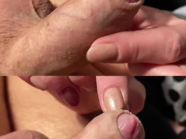 Foreskin and frenulum play with the hand with a double cumshot