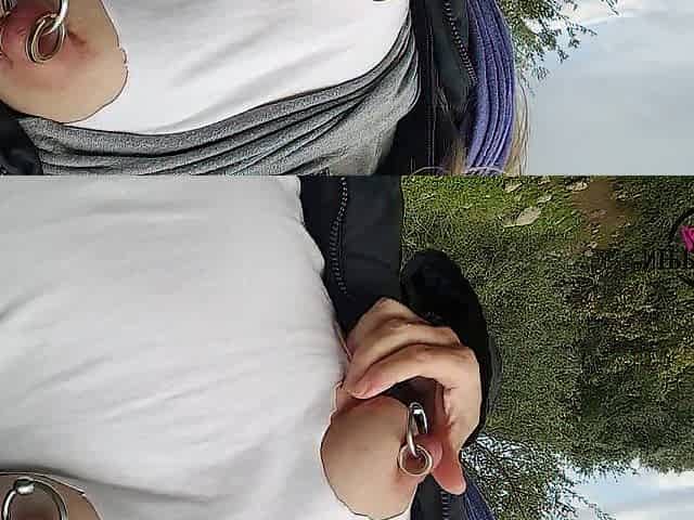 nippleringlver flashing pierced breasts stretched teat piercings outdoors in public forest