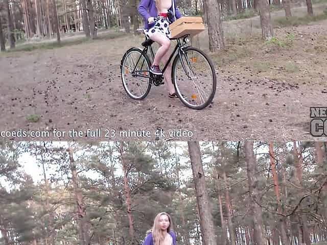 Sexy teen training in a forest with sucking and rides on stranger's outdoor