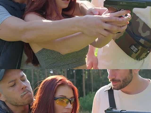Petite female soldier blows two muscular colleagues before getting rough double penetration in the forest