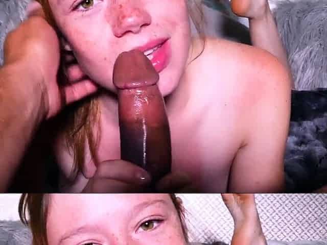 Voluptuous 18-year-old ginger babe blows and eagerly swallows a massive load
