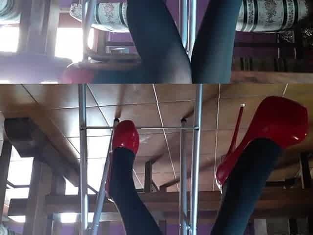 Laura on Heels amateur 2021 sitted on a bar stool on hot platform red heels