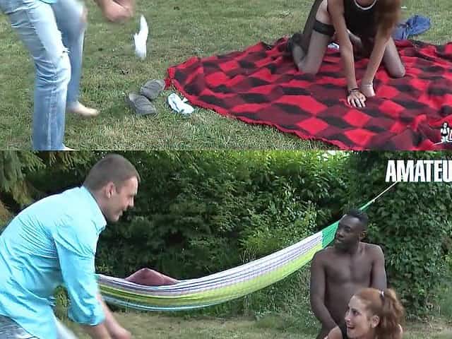 Curvy black girl from France eats white cock cum outdoors