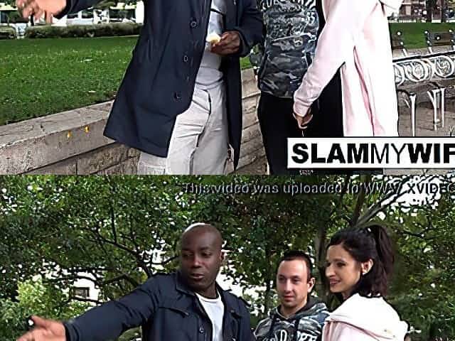 Beautiful white model Natalie Porkman dominated by two black men