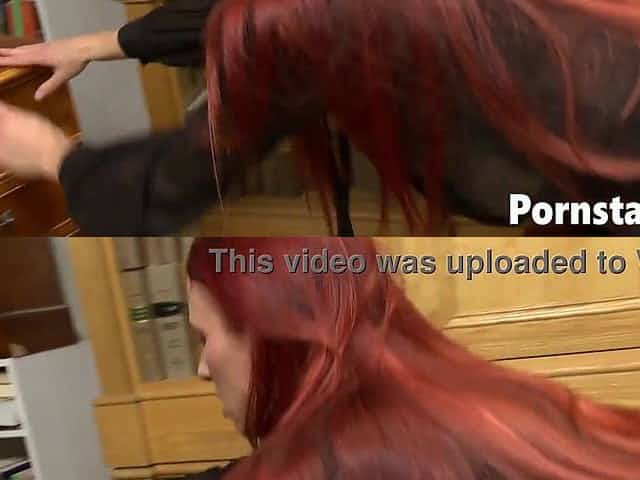 Redhead with big boobs riding cock on the chair