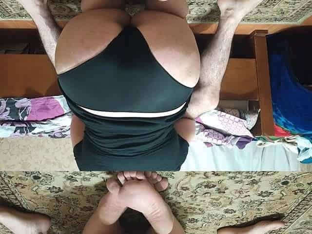 Indian girl with big ass in black dress starts to lick her boyfriend's dick in the bedroom