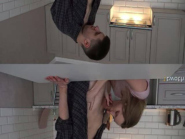 Housewife in Constricted Cropped Top Screws Joyfully on Kitchen Table