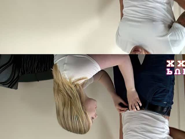 Slutty light haired teen provides her kinky neighbor with stout blowjob