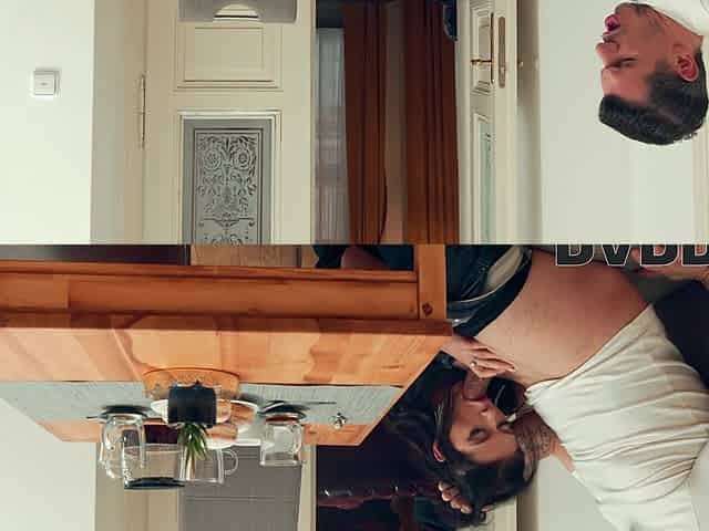 Brunette wife with big boobs gives blowjob