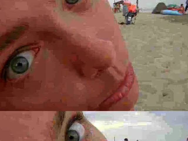 Mature Jamie Brooks spreads legs for double penetration on the beach