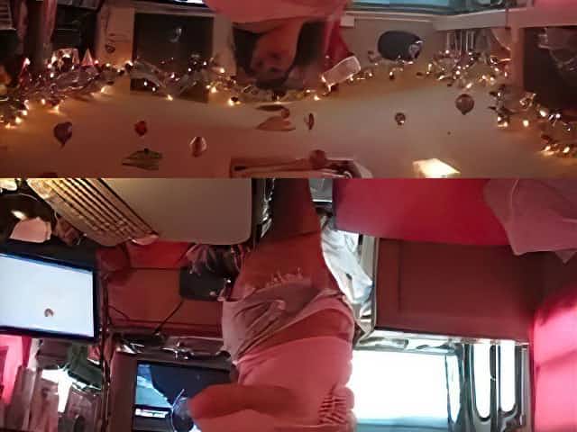Playful web camera sweetheart plays with her fur pie standing on her all four