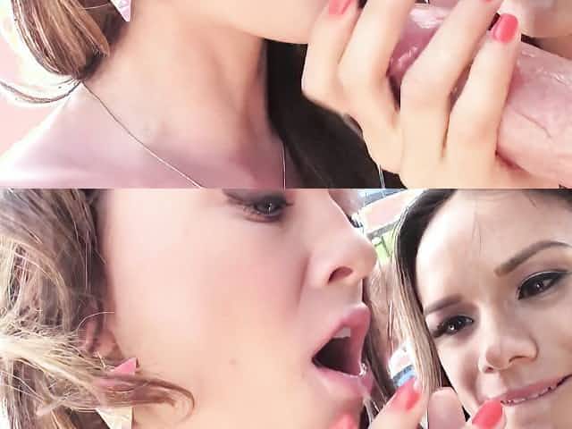 horny bombshell Aina blows her friend's hard pecker on the floor