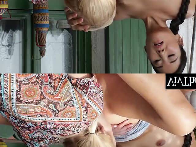 Young Lesbians Angie Koks n Alexis Brill Scissor in the Back Yard