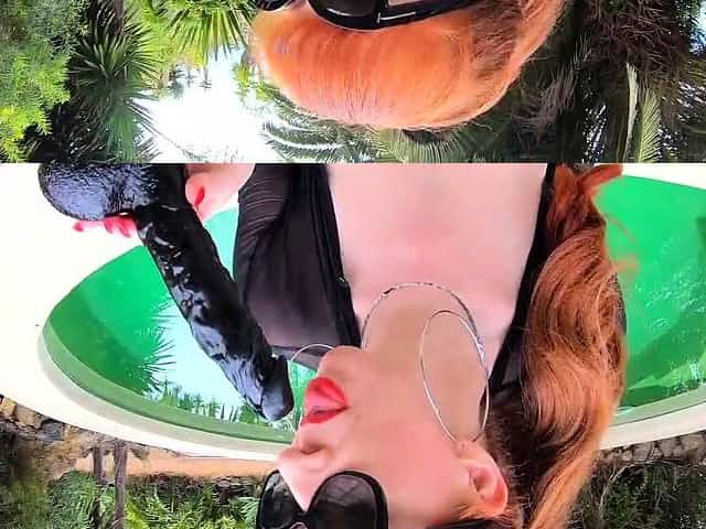 Red fucks a big black dildo in the backyard