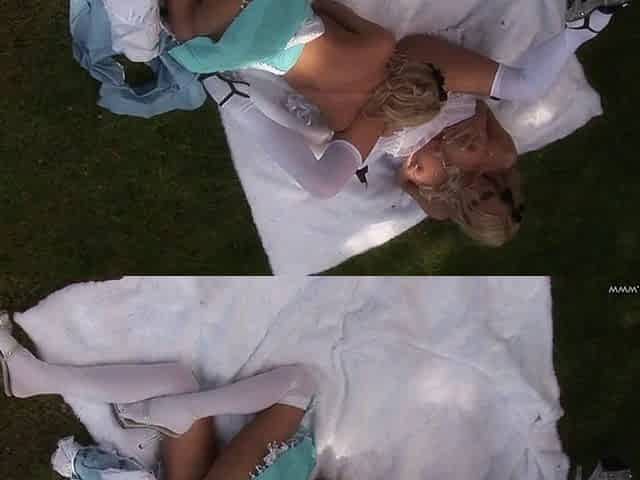 Blonde Angela Stone and Genesis Sky wanking on backyard
