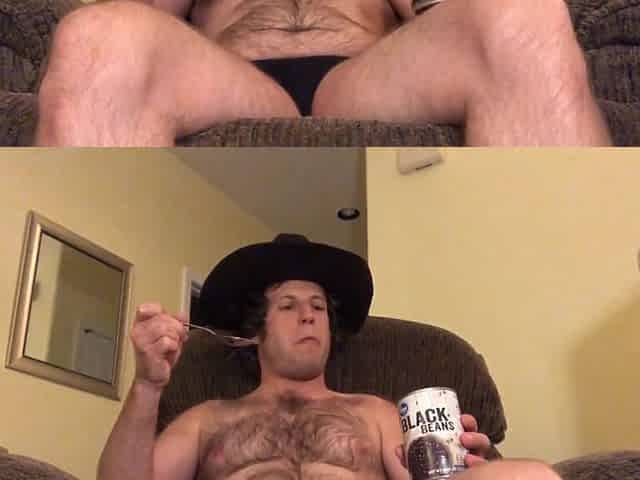 Hairy cowboy in thong eats beans & farts