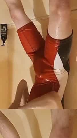 An athlete in a wrestling suit jerks off in the shower and then cums