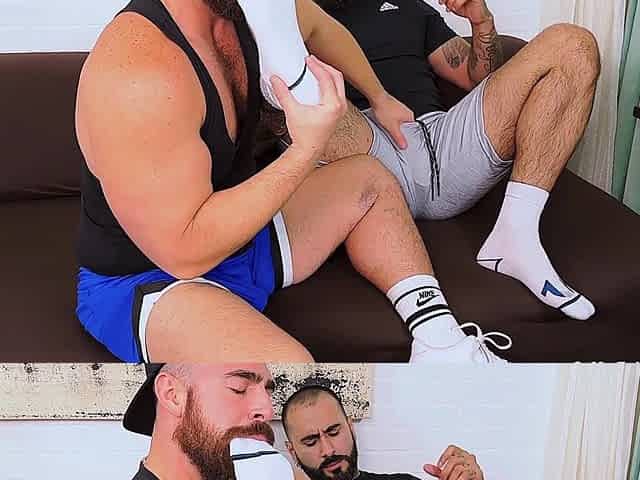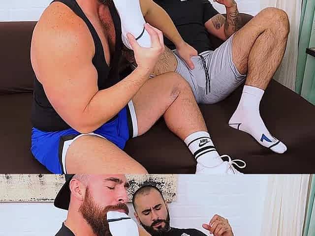 Hunk gym buddies cum together after foot play and worship