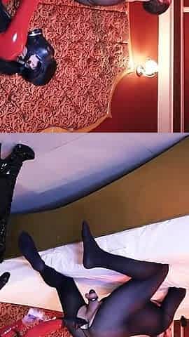 DominaFire in latex pegging with huge strapon