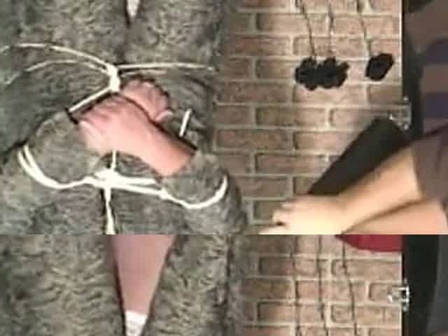 Alice milk her bound up sex serf with feet and hand.