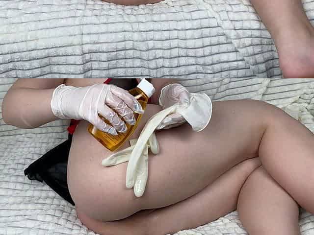 schoolgirl puts gloves in pussy and ass and pisses on them