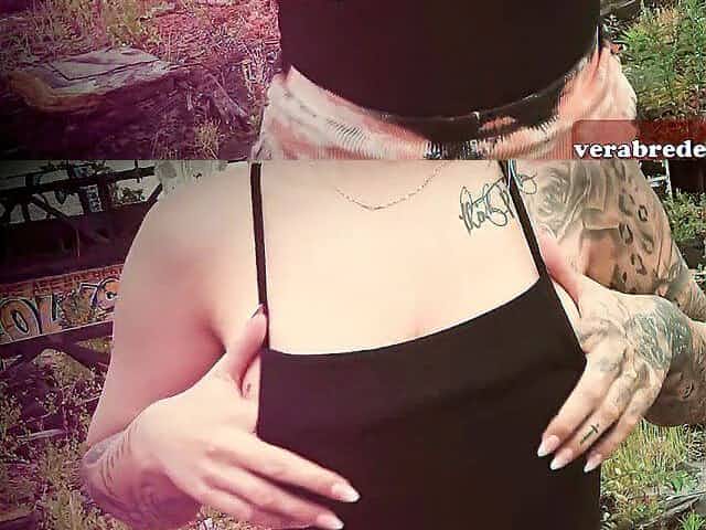 Inked, German brunette hair is squeezing her large bazookas whilst getting banged hard in the backyard