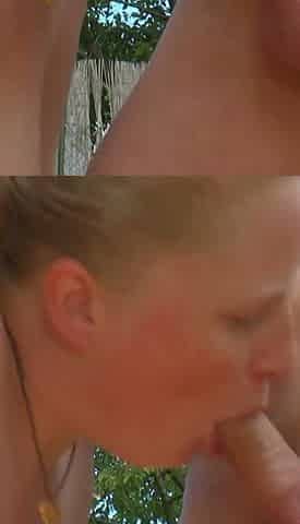 German Babe Sucks 2 Guys Outside Til They Cum in Her Mouth