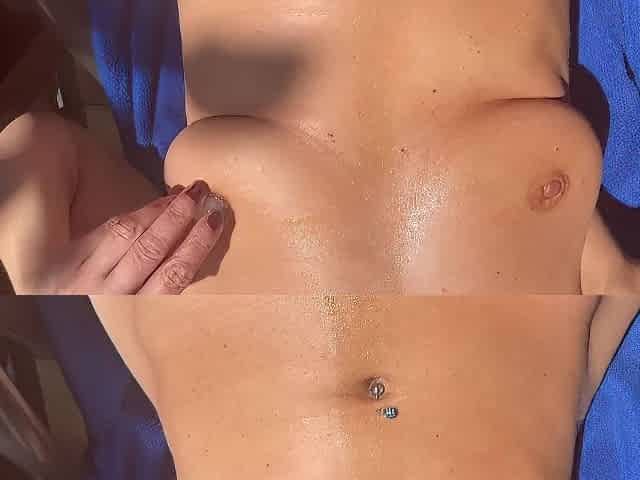 White girl massages her big boobs with oil