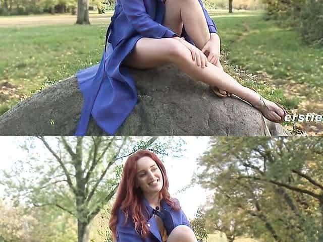 Young german lass plays with her snatch in a public park.