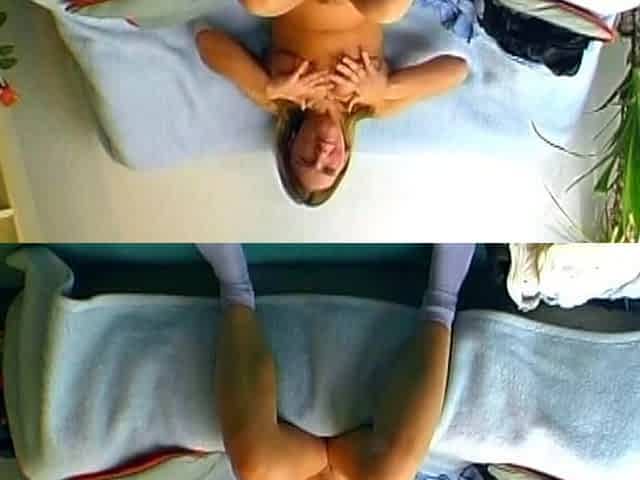 Blond with large boobs rubs herself on her juicy cleft