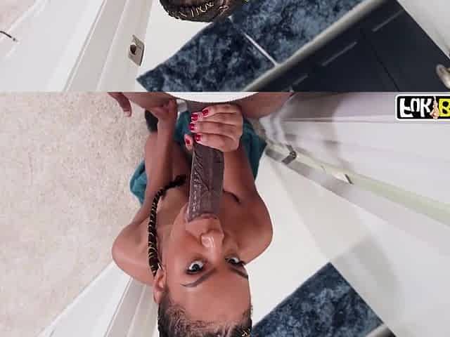 Tall black guy feeds his monster cock to a skinny white girl