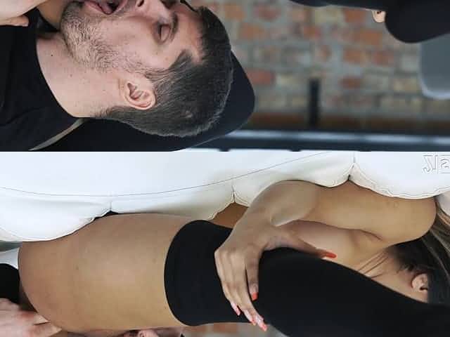 Teen in glasses gives a massage to her boyfriend and he fucks her nice pussy