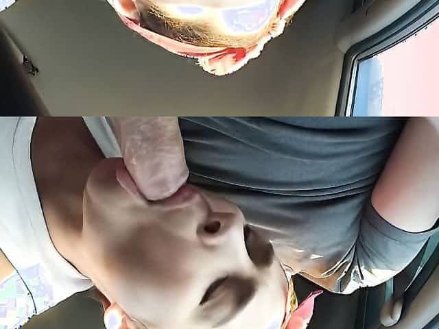 Short-hared girl blows her BF in the car while he's driving