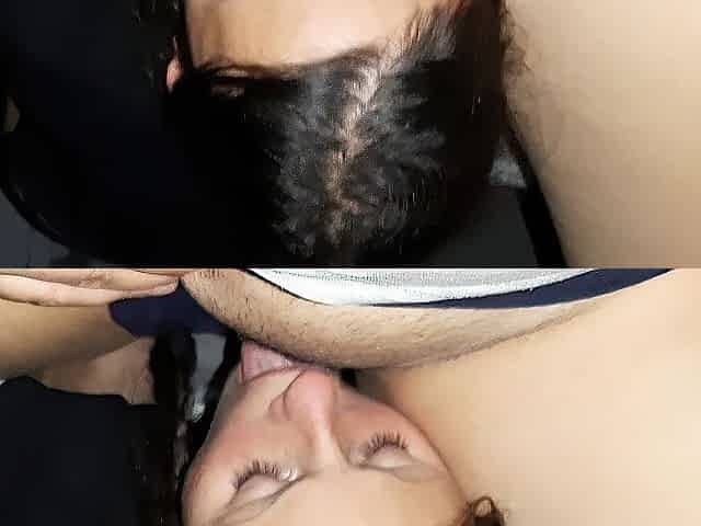 Unshaved amateur vagina licked with pants on
