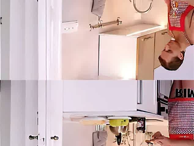 RIM4K. Gal interrupts repairer and begins licking his butt by the dishwasher