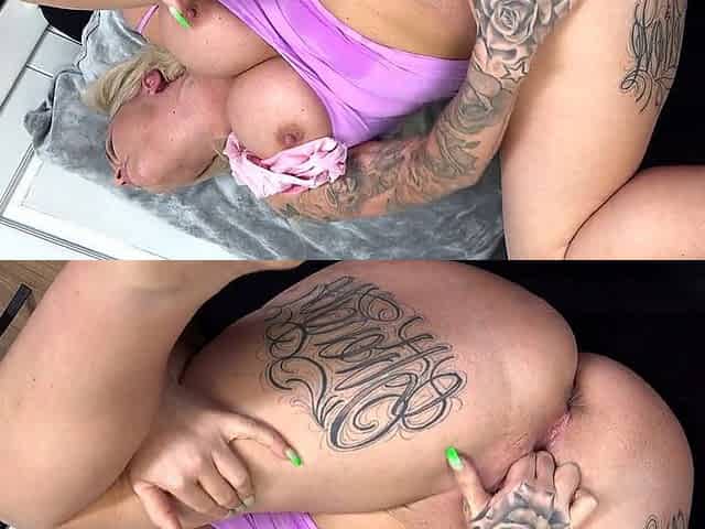 Strokies - Golden-haired with pierced nipps and tattoos gives a titty banging ejaculation