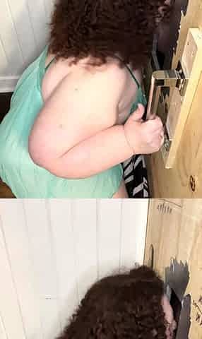Tricia Oaks, backstage action through a gloryhole