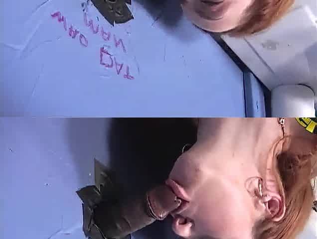 Good looking redhead Trinity Post giving a blowjob thru a gloryhole