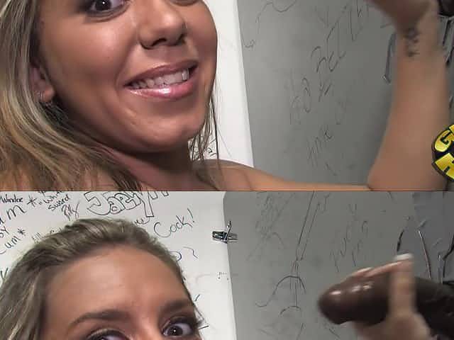 Blonde porn star sucking a stranger's huge cock through a glory hole
