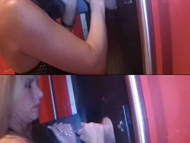 Gloryhole cock sucking with big boobed blonde in sexy lingerie