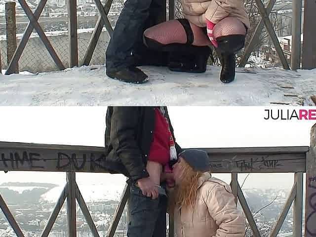 Sexy redhead rides a hard cock out in the cold snow