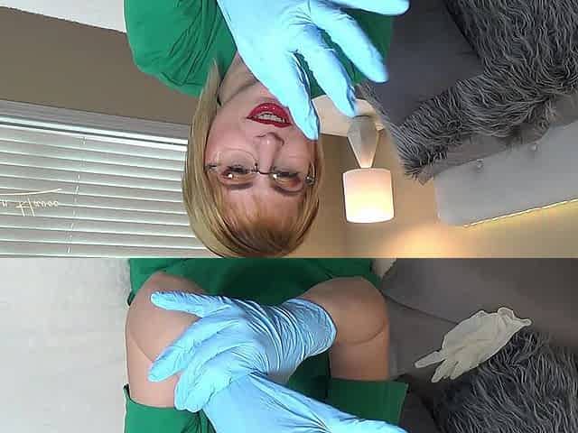 Nurse in white stockings and latex gloves masturbates on a gynecological chair