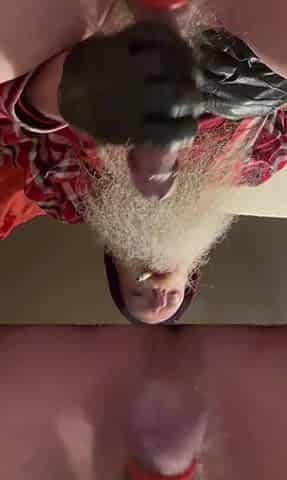 Gift to my giant fan: tugjob in gloves, whilst is watching one of my movie scenes, with spunk fountain