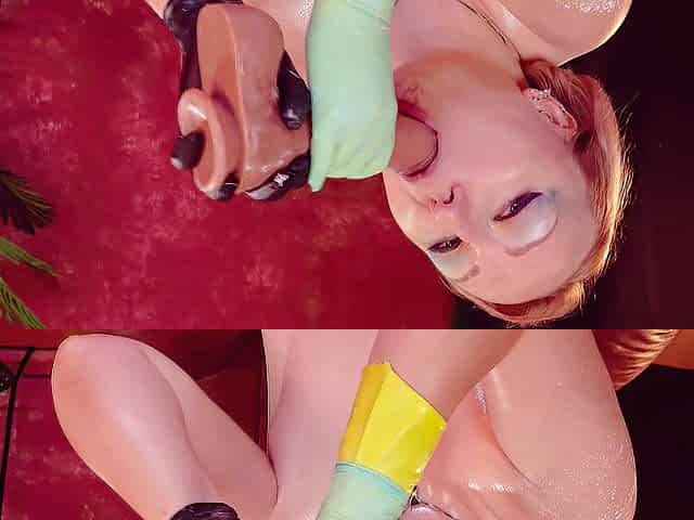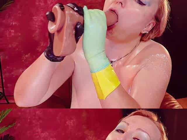 Latex rubber gloves fetish: sextoy oral job with ahegao face. Arya Grander
