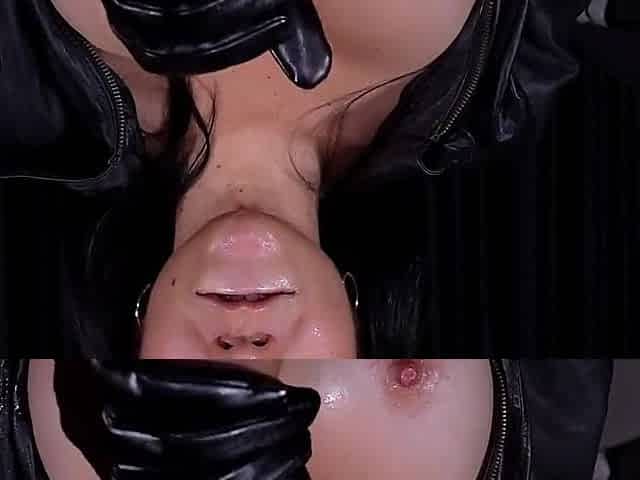 Arya Grander in long leather gloves with an oily face for an ASMR experience