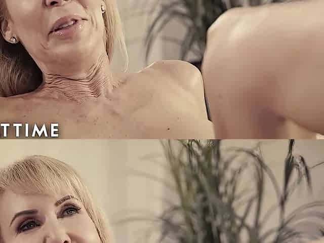 Blond granny gets screwed from the one and the other ends