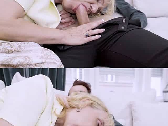 Mature blonde slut sucks young dude's hard tool