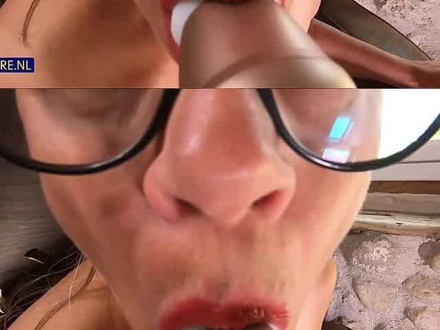Orgasm craving mature blonde sucking a vibrator on floor