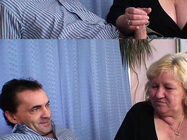 Busty blonde old grandma swallows two cocks