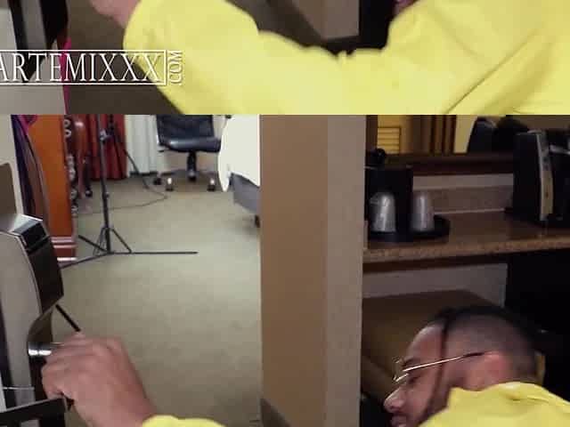 Fiery ebony chick with a great ass is fucked doggystyle on office floor